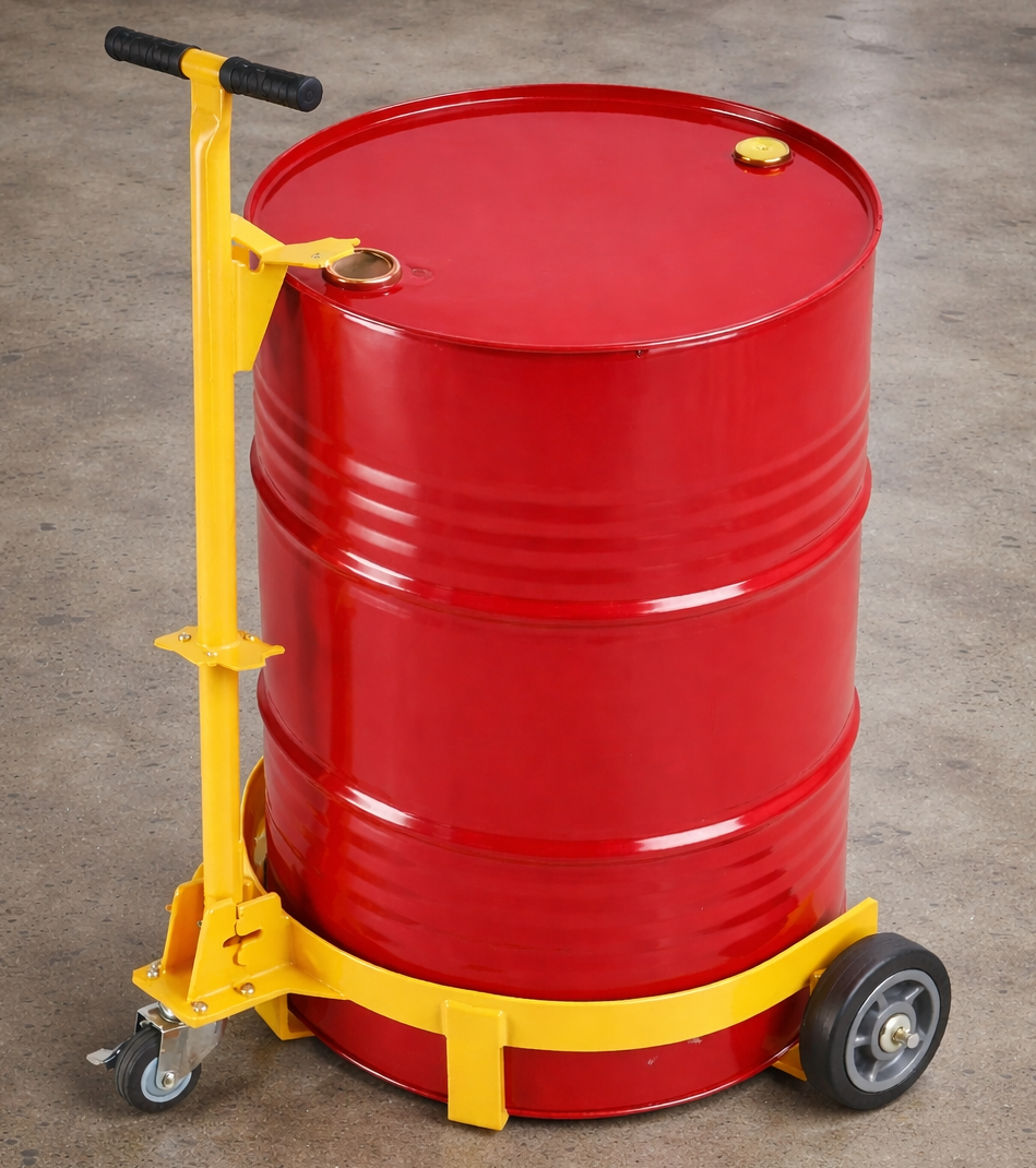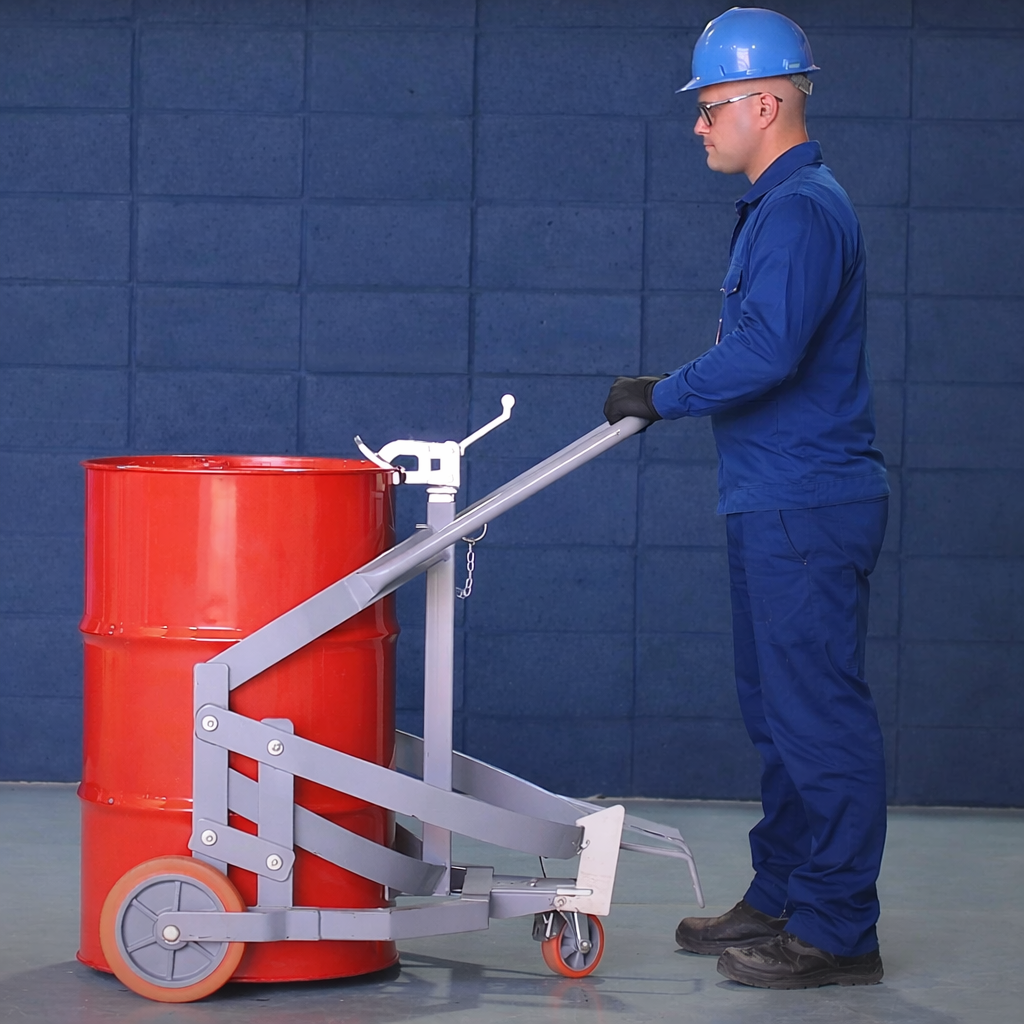 Por fim, chegamos ao carrinho transportador de tambor, que pode ser considerado a solução completa para esse tipo de operação. Nesse equipamento, o operador apenas guia o carrinho até o tambor, prende a borda do recipiente por meio de uma garra superior e aciona um pedal para realizar a elevação. Esse pedal é facilmente acionado devido à união entre engenharia e design de produto. A partir daí, o operador passa a apenas conduzir o equipamento, sem precisar aplicar força para sustentar ou movimentar o peso do tambor.