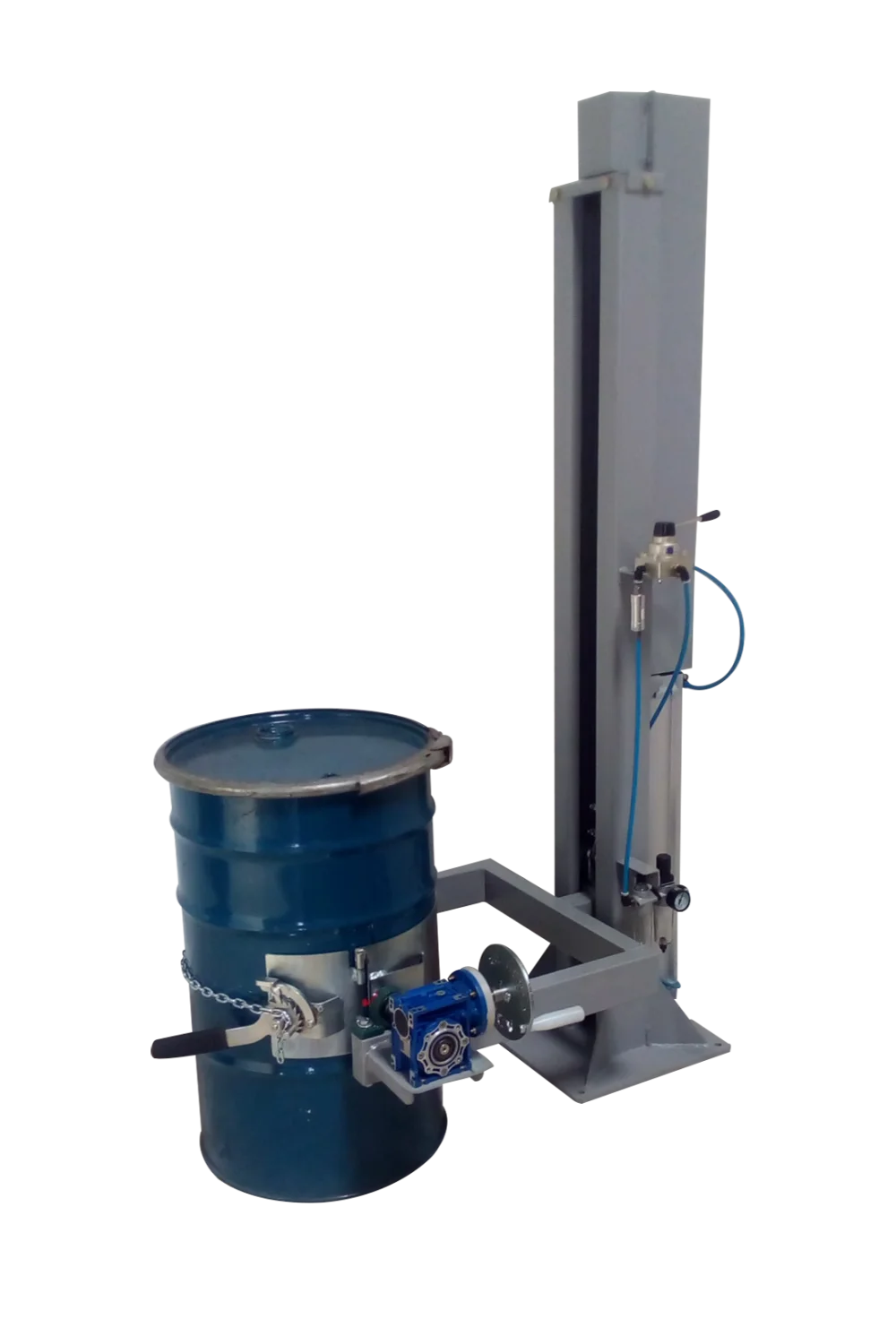 Os tambores ou barricas são elevados ou abaixados através de um cabo de aço em conjunto com um cilindro pneumático; O sistema pneumático e composto por cilindro pneumático e válvulas direcionais que trabalha com uma pressão de ar de aproximadamente 7 Bar ou 100 PSI;